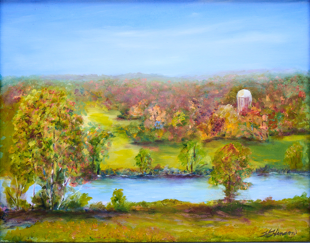 In James River at Tuckahoe Plantation, Harvey L. Hinson captures the timeless grace of Virginia’s landscape as seen from the rolling fields of the historic plantation. The river glides gently through the composition, its cool blue tones contrasting with the warm, sunlit hues of the surrounding countryside. Trees in their autumn colors frame the scene, their reflections softened by the calm water below, while a distant silo rises quietly among the hills—a subtle reminder of the land’s agricultural heritage and enduring rhythm.